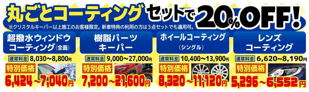 | 工程 | 手洗い洗車+下地処理 (水あか落とし)+ガラスコーティング+レジン加工 |